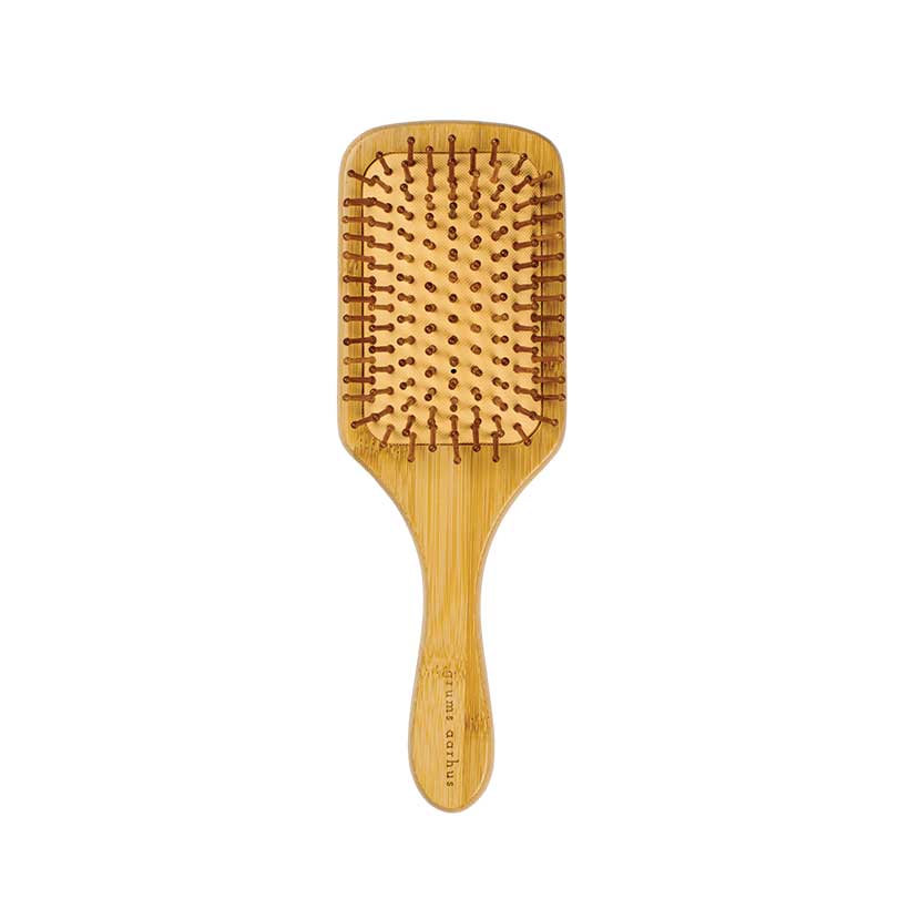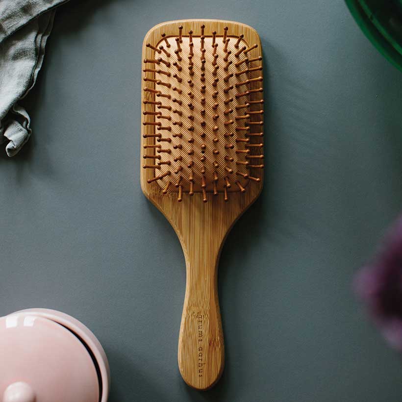 Escova de Cabelo de Bambu Grums com base de borracha natural e cabo e dentes 100% de bambu. Não cria eletricidade estática durante a escovagem do cabelo, evitando assim a perda de cabelo saudável. Uma ótima alternativa às escovas de cabelo que têm plástico na sua composição e que ainda não possuem uma alternativa viável de descarte após o uso.