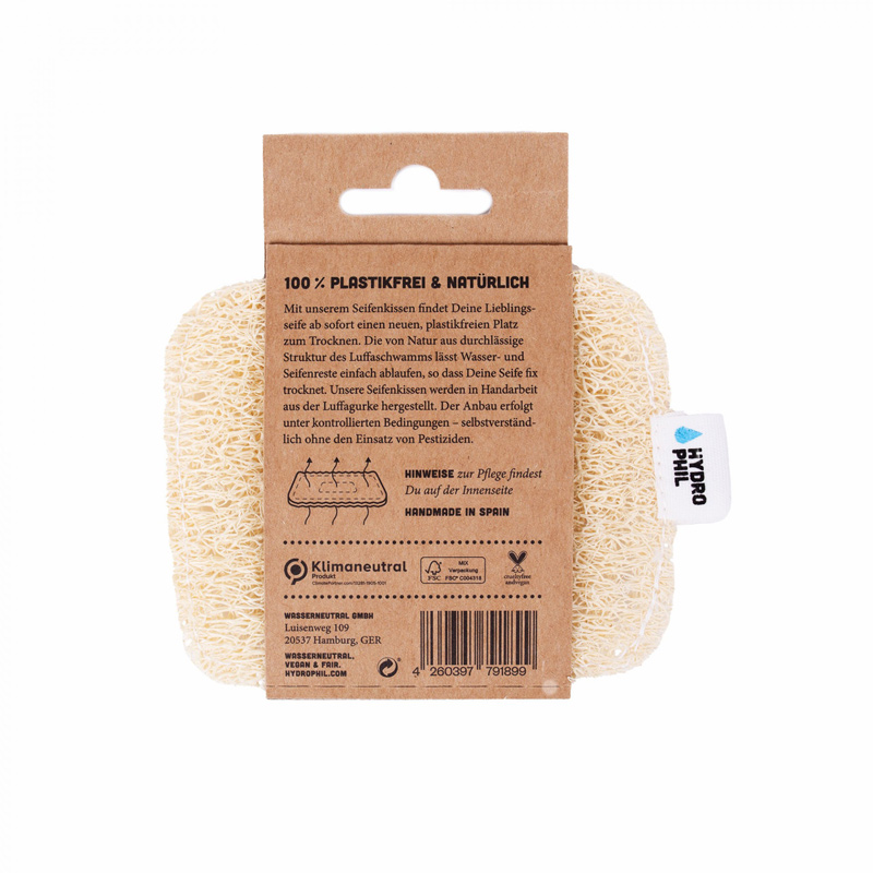 Antes da primeira utilização, coloque um pouco de água na luffa para que as fibras se desdobrem e a almofada se torne permeável ao ar. Depois disso, estará pronta para secar os sabonetes ou champôs sólidos após o uso. A saboneteira perfeita, 100% biodegradável! A luffa deverá ficar num local seco (não deverá ficar em contacto permanente com água).