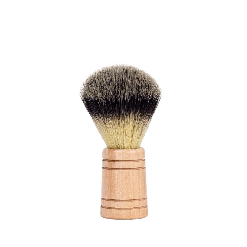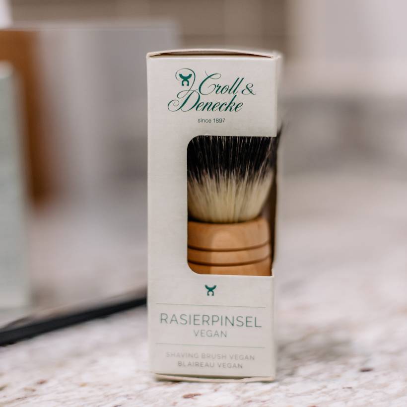 Pincel de barbear Croll & Denecke com cabo de madeira e cerdas sintéticas veganas e sem crueldade animal.